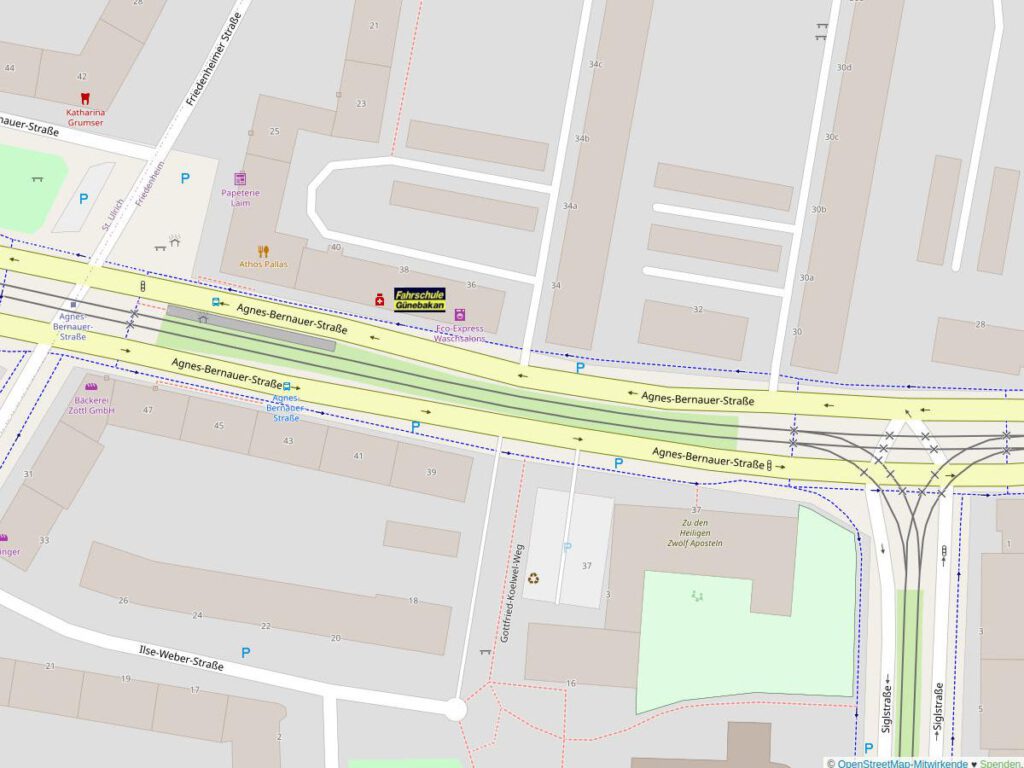 Vom S-Bahnhof „Laim“ sind es ebenfalls ca. 10 Minuten. Hier am besten die Landsberger Straße Richtung Osten, dann rechts in die Friedenheimer Straße und dann in die Agnes-Bernauer-Straße 30 Meter nach links, direkt vor die Fahrschule.